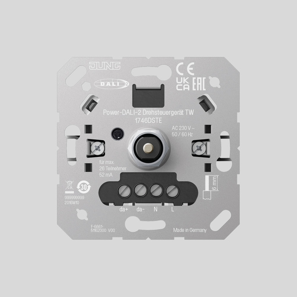 Über die Drehsteuergeräte lässt sich Licht klassisch schalten und dimmen. Ihre Tunable-White-Funktionalität gestattet es zudem, intuitiv per Druck und Drehung die Farbtemperatur von Leuchtmitteln zu justieren. Je nach den Möglichkeiten des Leuchtmittels sind dabei 2.000 bis 10.000 Kelvin wählbar. Manuell oder in Verbindung mit dem JUNG KNX Smart-Home-System können so vielfältige Lichtstimmungen umgesetzt werden.